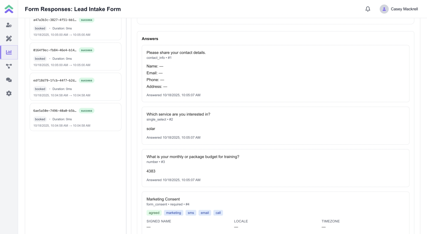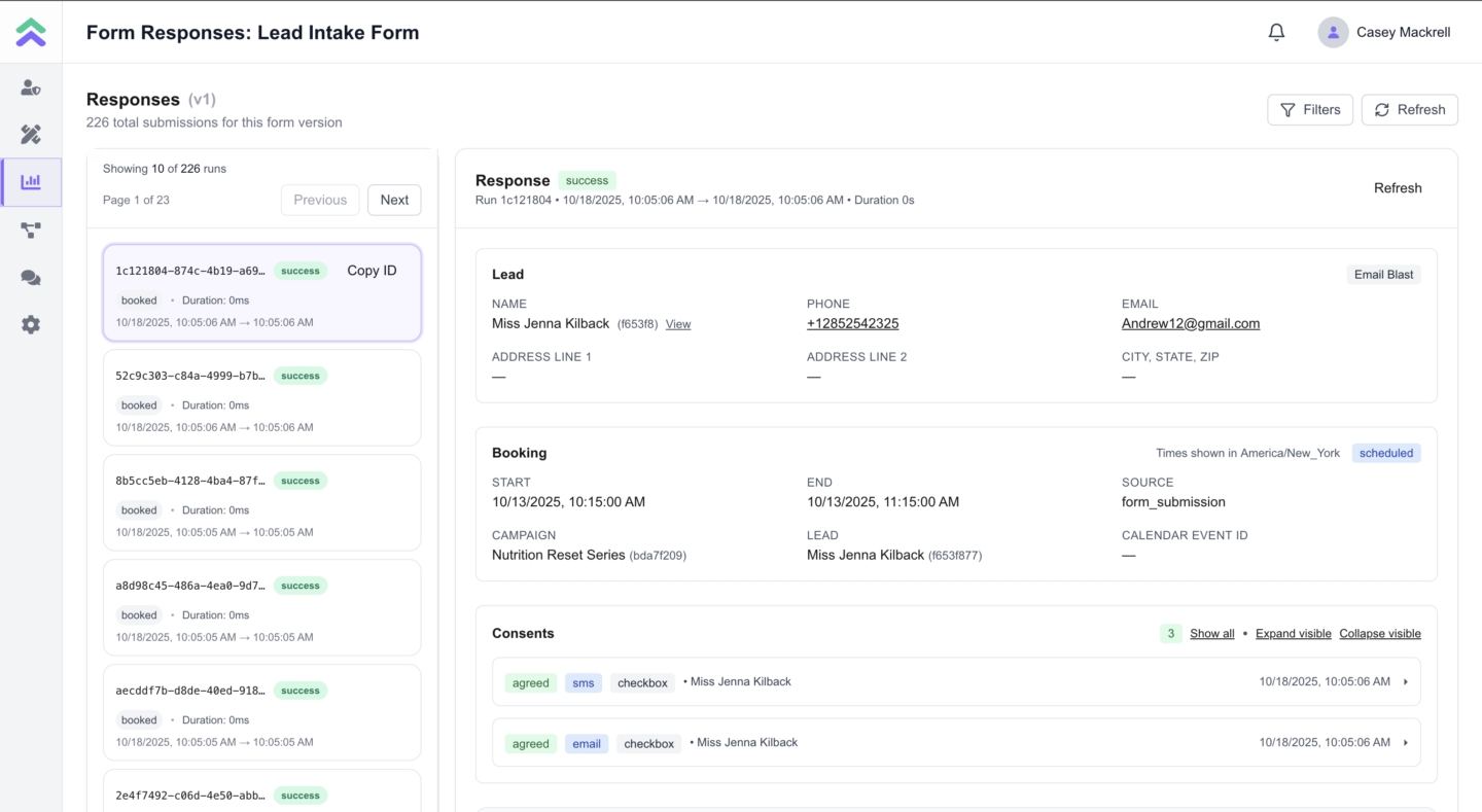 Click on Analytics to view your responses. See the lead attached to the response, the booking if applicable, any consents given, and answers to the questions! Filter by All time, today, this week, this month, or a custom date. Forms will be labeled as "success" if completed and "partial" if started but not completed. We save each question so you will always have the data that is submitted, even if they didn't complete the form.