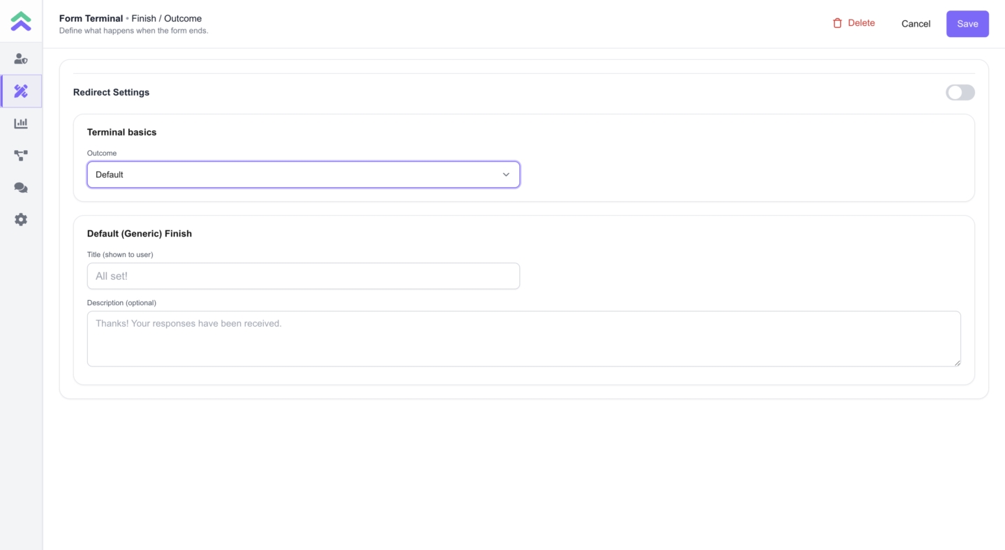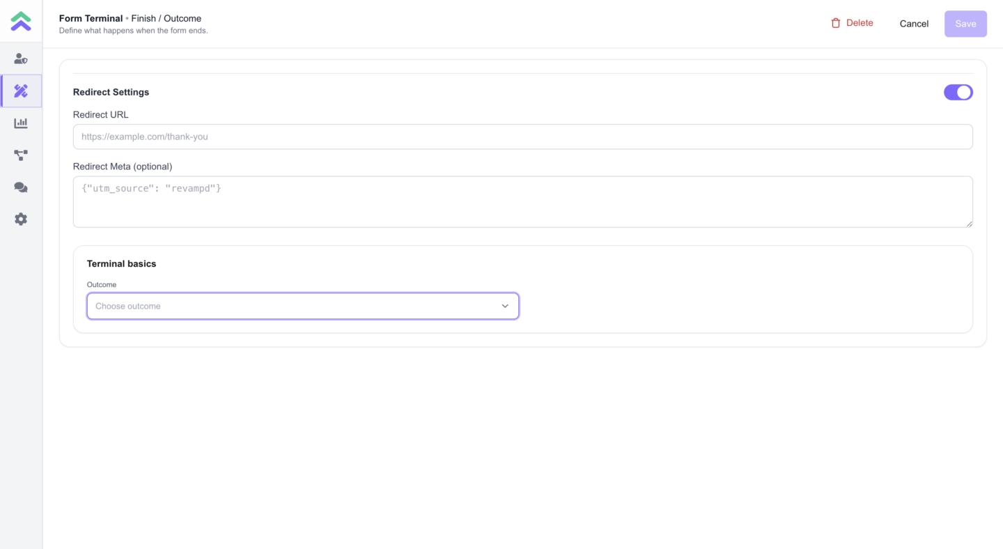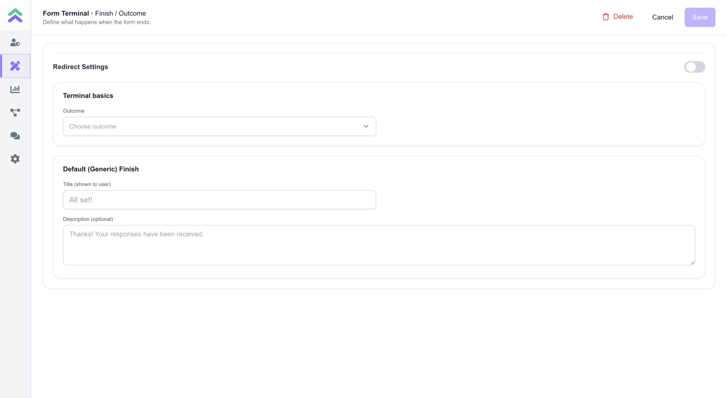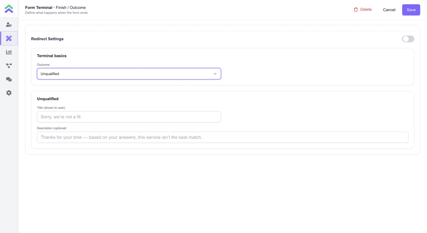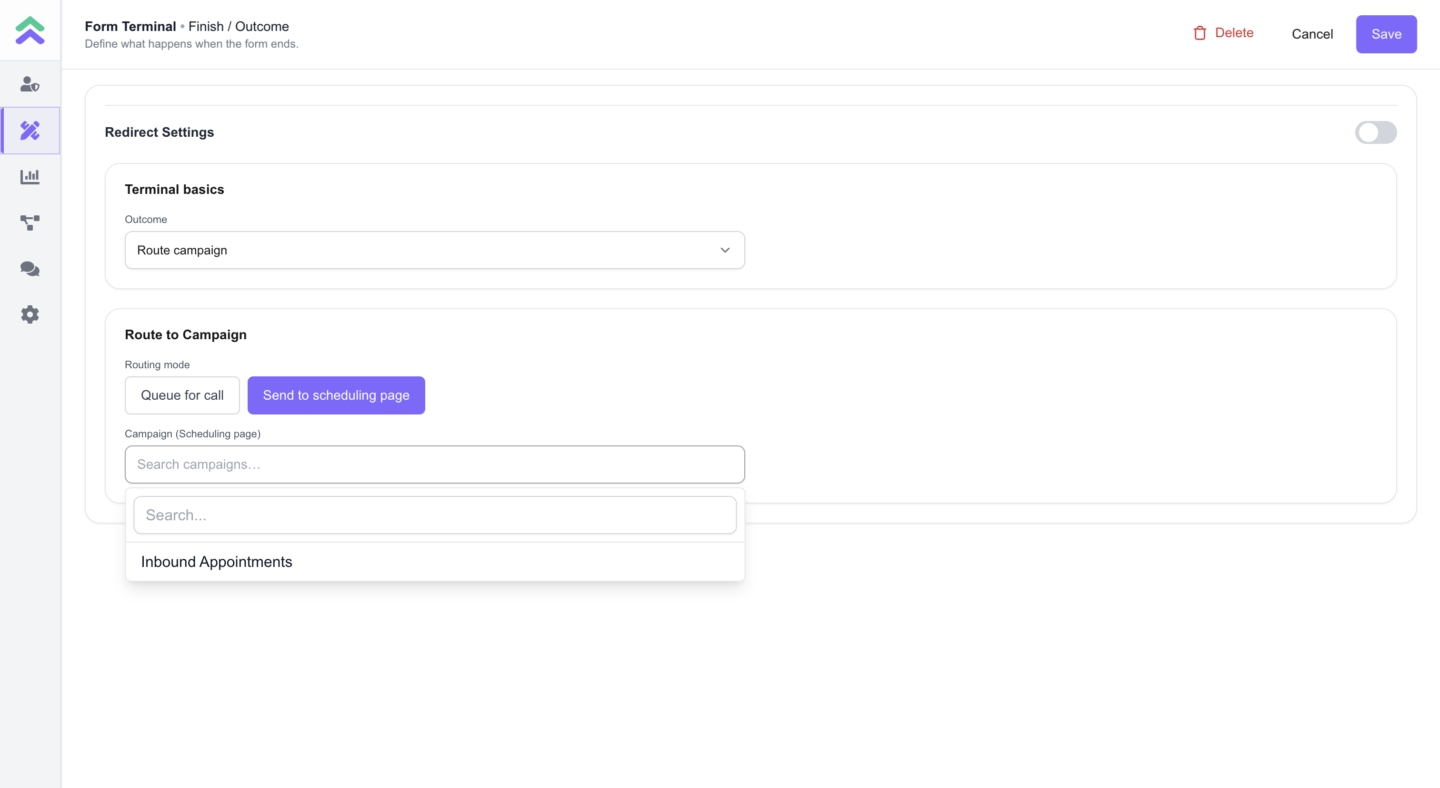 Choose between Route to Campaign, Default, and Unqualified. Route to Campaign then has 2 options. You can either queue for a call, or have them schedule directly in the form. If you are a partner and want to charge per booking. Ensure you enable "Charge on Submit". If you want to redirect the person after showing the end screen or after they successfully book, turn on redirect and add it to the url. We will then redirect after a few second pause