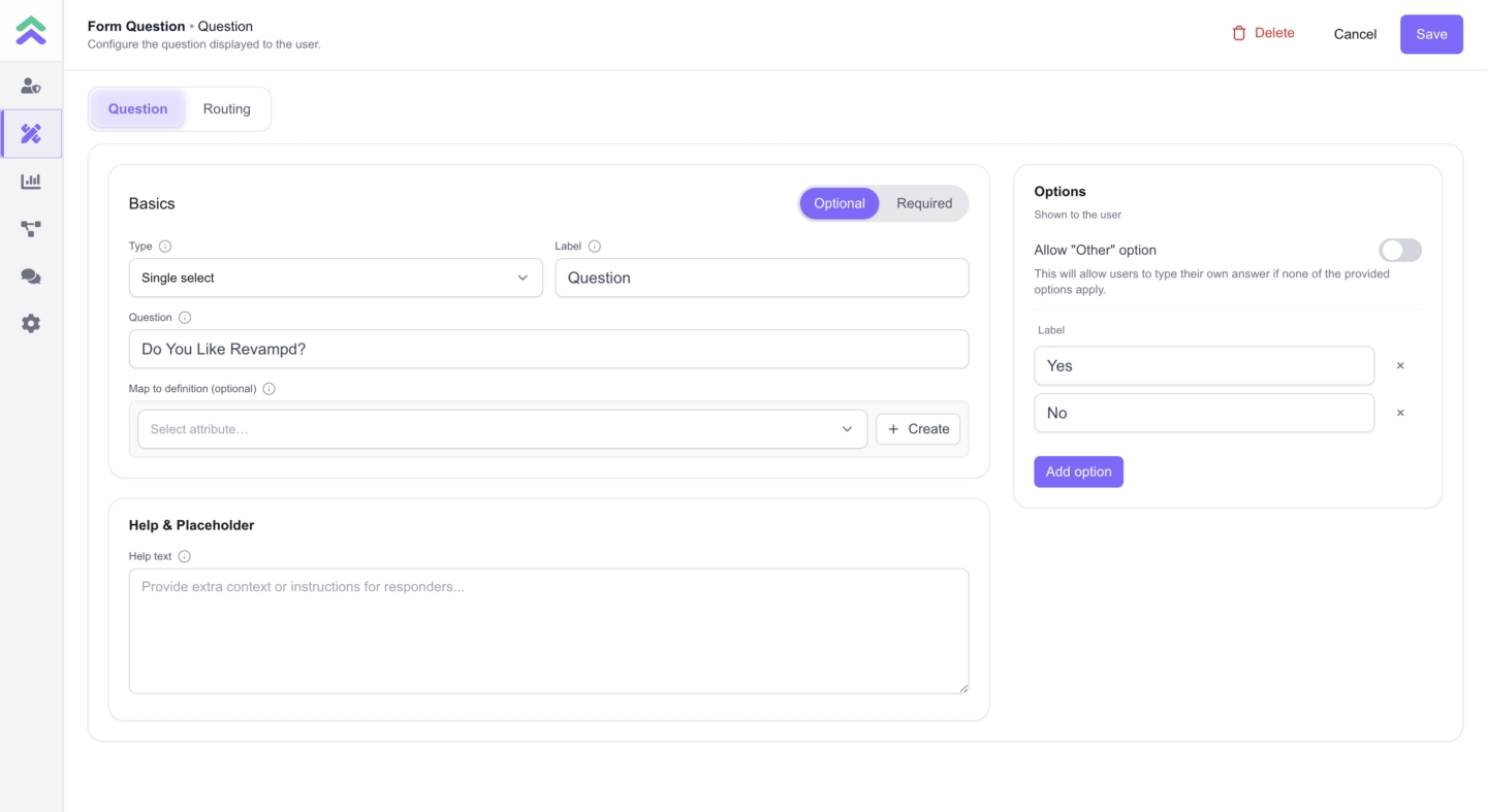 Single Select / Multi Select These allow you to list options for the user to choose from. You can enable an “Other” option so they can type a custom response. Both support up to 5 options. Only single and multi select questions can use conditional routing.