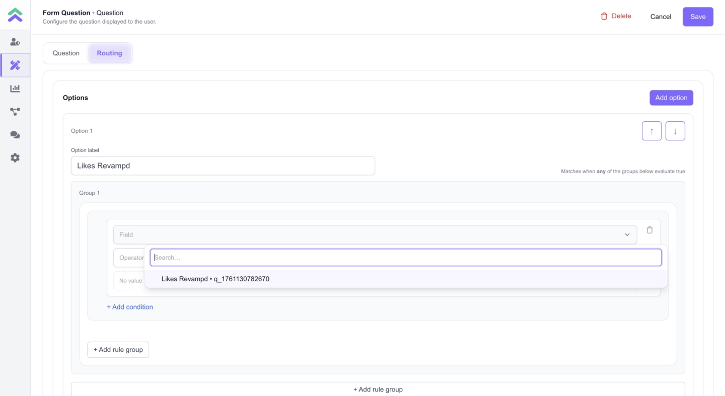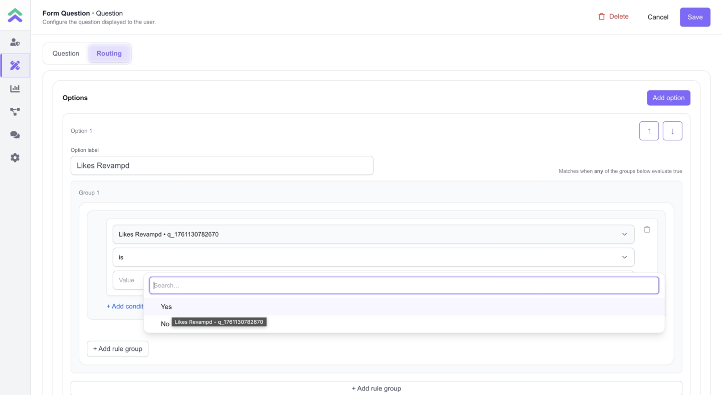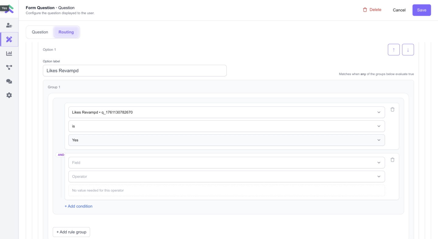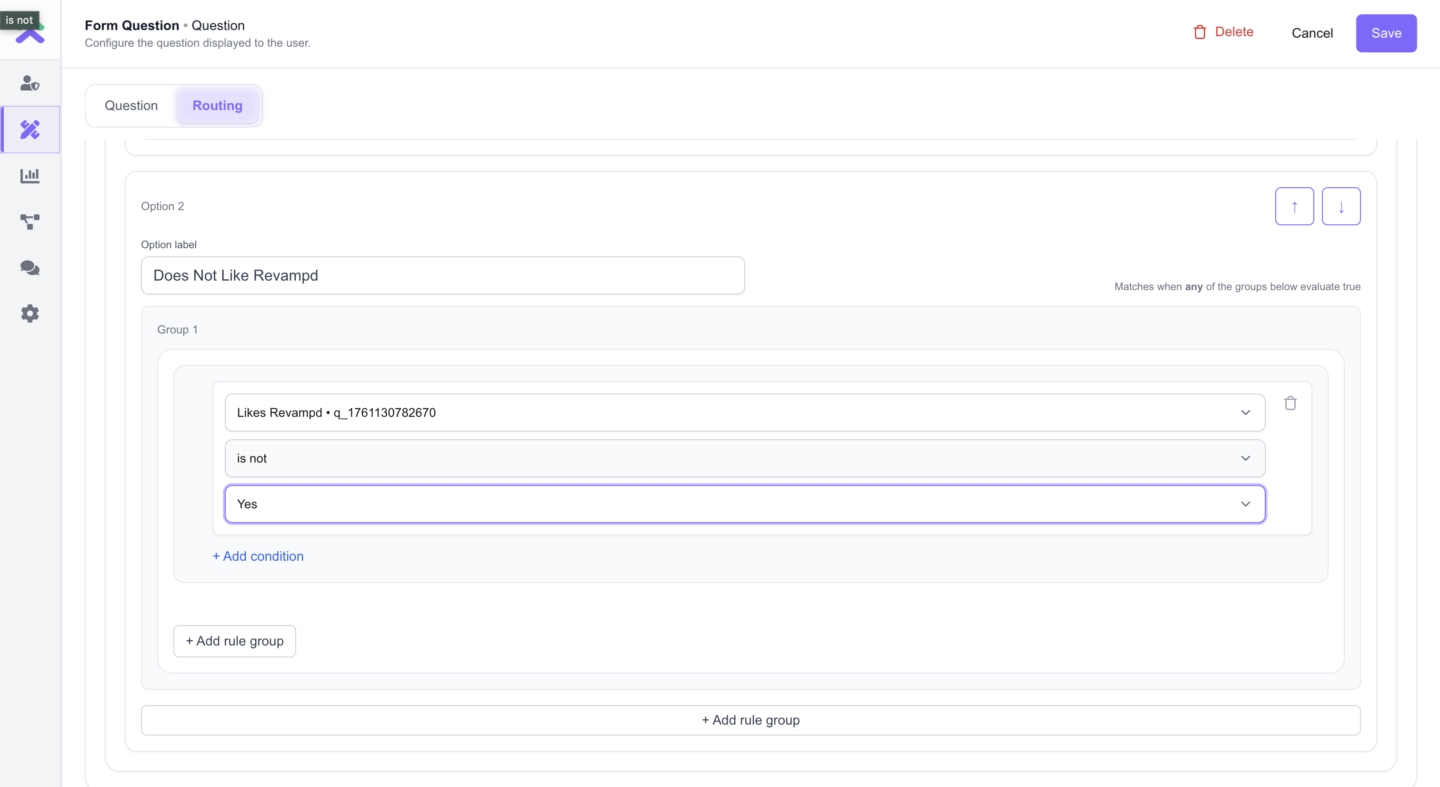 Create your first option and select the question to configure for routing. All of the support types will show up that were asked before so you can have grouped conditions based on multiple questions. Then choose the condition ("is" or "is not"). Lastly choose the value from the dropdown which will only show the options attached to the question.