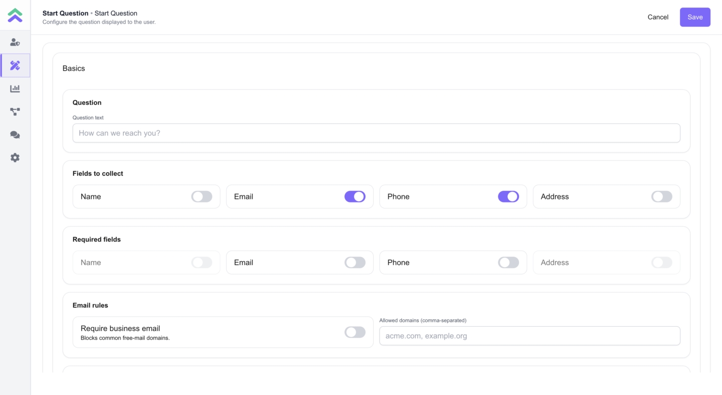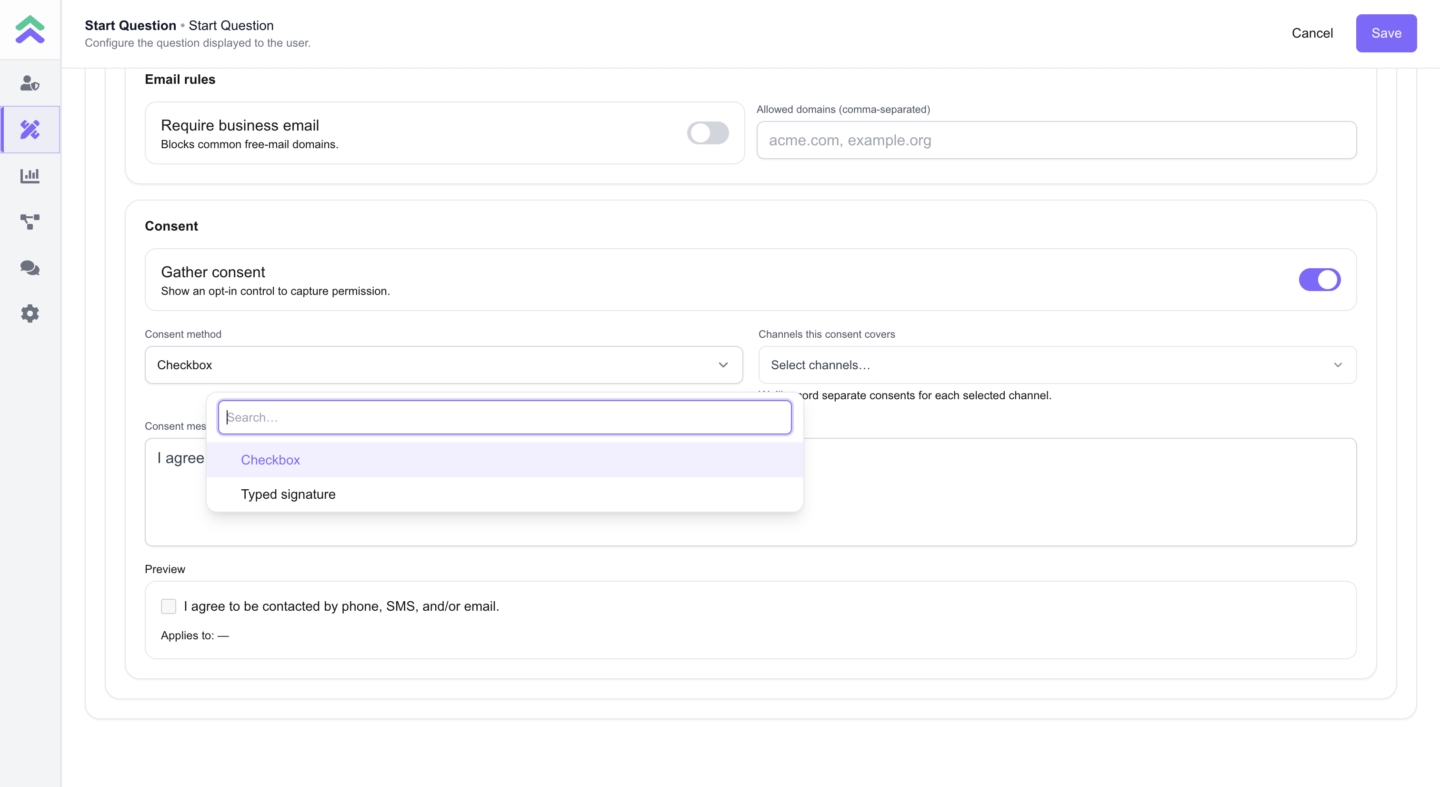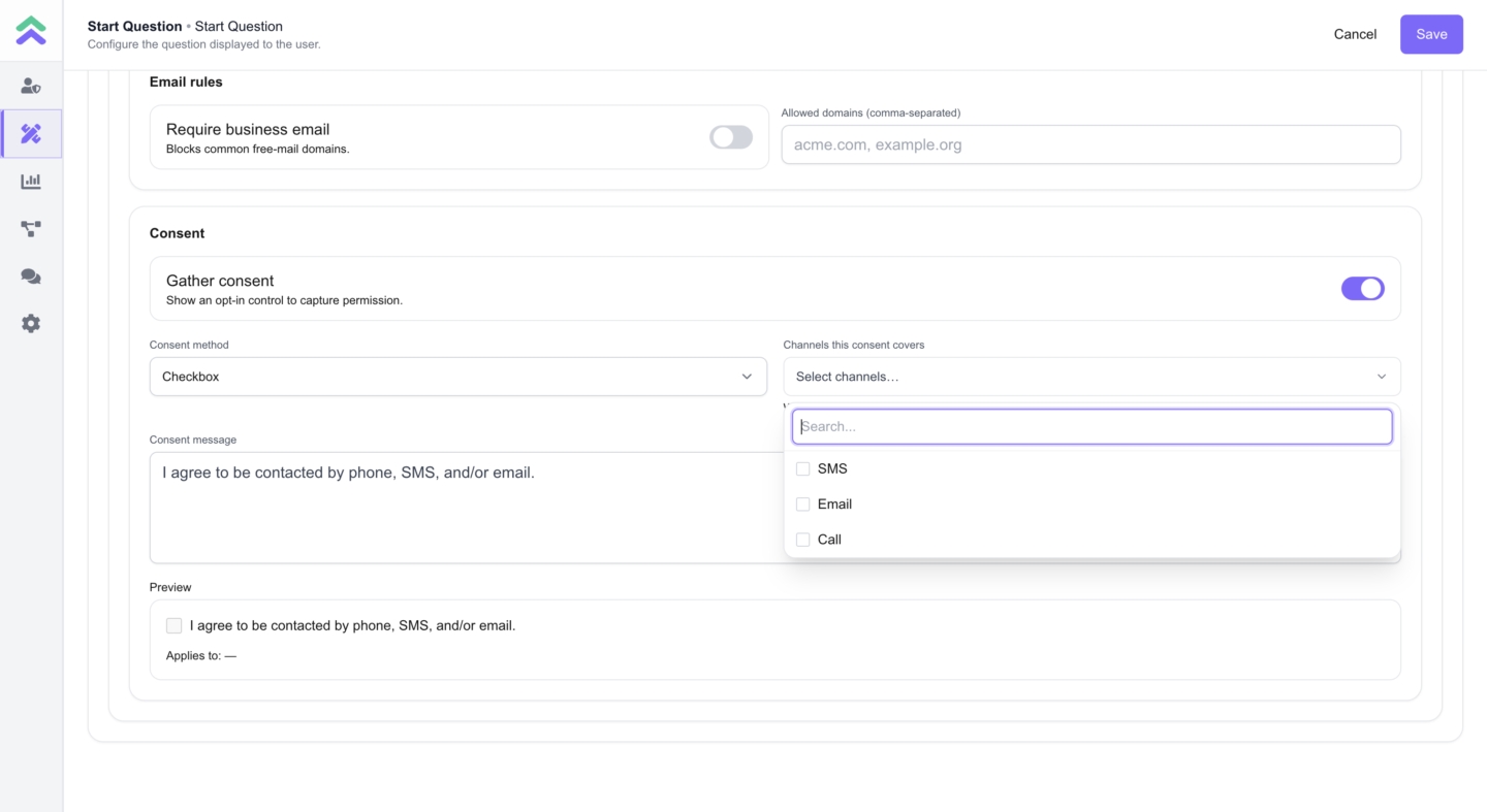 Configure what fields to gather and which are required. If you want to only allow business ables or specific domains you can configure that as well. To gather consent, turn it on and choose whether they just check a box or both check a box and type their name. Add in the consent message (please consult with your council, and if you are going to use the outbound dialer, ensure to include opting in to ai calls). Lastly select what consent channels based on your messaging