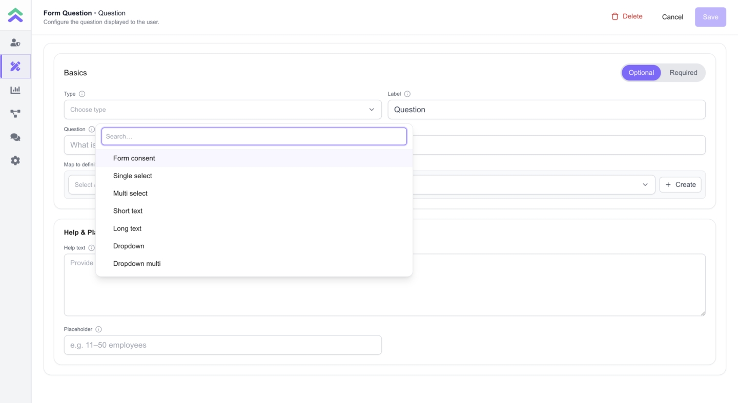Only supported by single / mutli select and dropdown / multi dropdown. Configure the question to ask and the options.